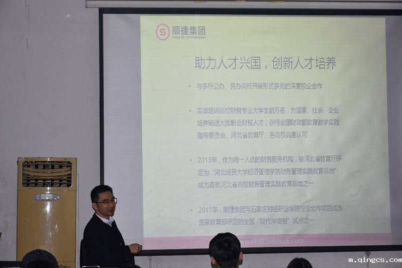 为了使财务管理专业学生学习的理论知识更好地融入实践之中、提升其实践操作能力,11月23日,管理系邀请河北顺捷财务咨询有限公司,在一教305教室进行了为期四天的财务管理专业素质提升实训活动。顺捷公司总经理李晨钟,主管经理申占业,管理系主任唐振龙及相关老师和61名学生参加了此次活动。