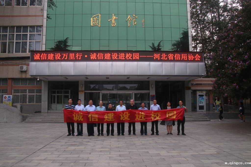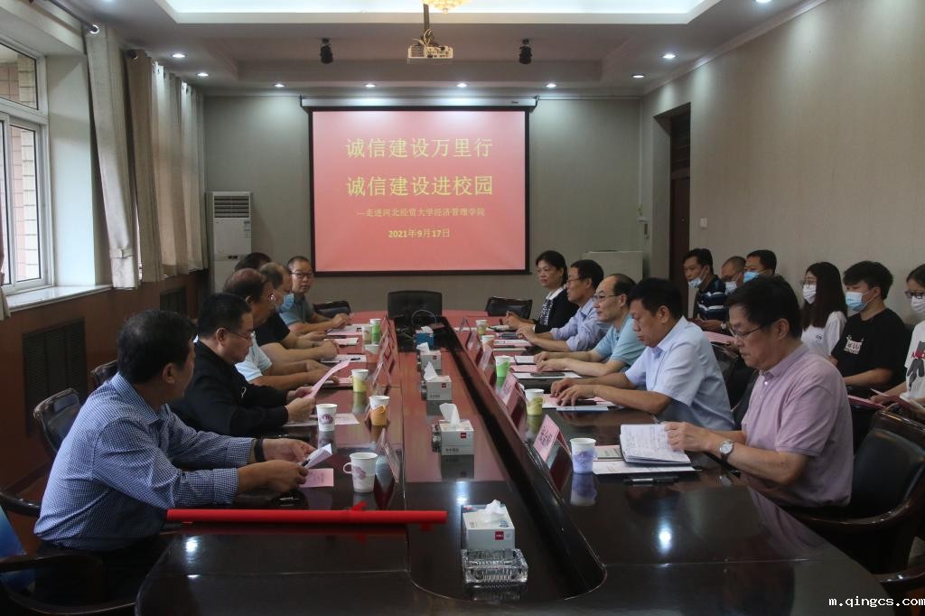 9月17日下午,由河北省诚信协会举办的“诚信建设万里行”——诚信建设进校园活动在我院举行。河北省社会信用体系建设领导小组办公室二级调研员张帅,省信用协会顾问委员会主任、原省工商局巡视员孙芳,省工商联副主席、省信用协会会长、天山实业集团董事局主席吴振山,省信用协会执行会长、书记白建军,省信用协会创业就业专业委员会秘书长、河北华一智慧城市科技有限公司总经理丁江涛,与学院领导马斌、张进良、江秀军、张金桐、张丽英共同出席活动。